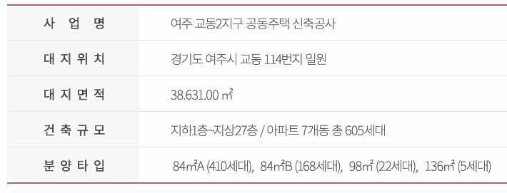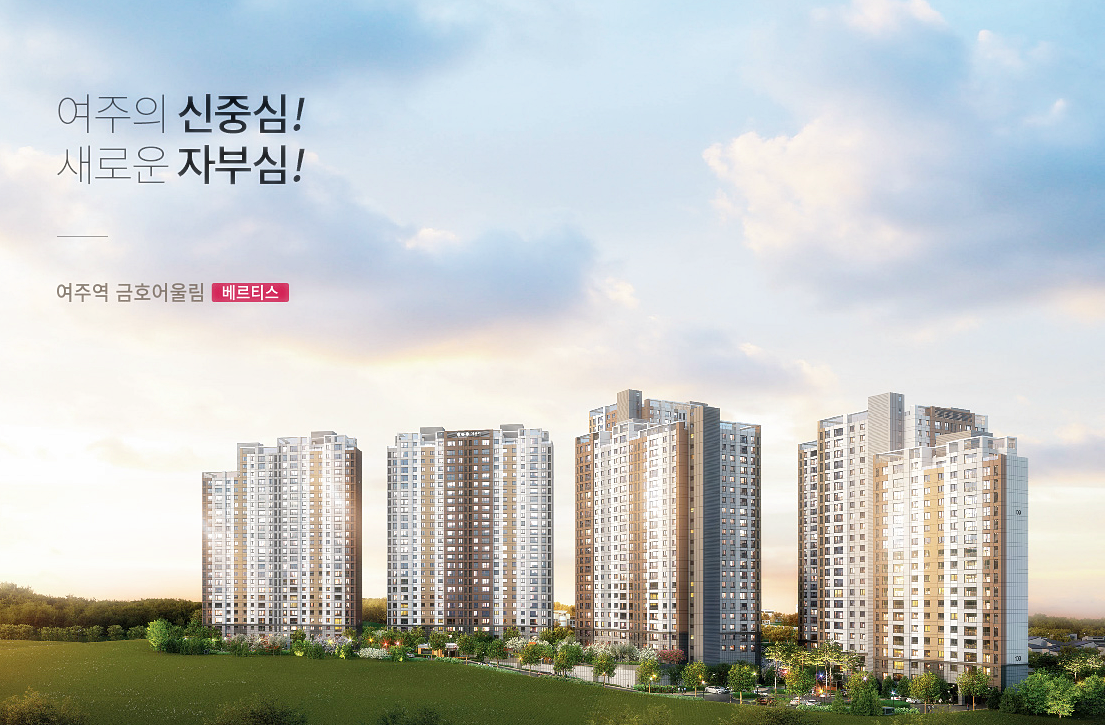 ‘여주역 금호어울림 베르티스’는 여주시에 처음으로 선보이는 금호어울림 브랜드 아파트이다. 경기도 여주시 교동2지구(교동 114번지 일원)에 지하 1층~지상 27층, 7개동, 전용면적 84~136㎡, 총 605가구 규모로 조성된다. 전용면적 별로는 △84㎡ 578가구 △98㎡ 22가구 △136㎡ 5가구 등이다. 서울 경기 인천 지역 신규 분양 단지에 대해서는 아래에서 추가 정보를 얻어보세요.