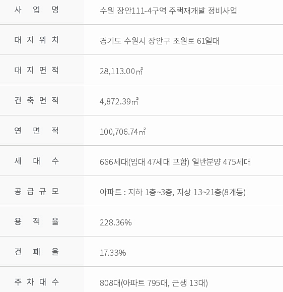 광교산과 영산공원이 인접해있고 수원 KT위즈파크 야구장과 홈플러스, CGV 영화관, 조원시장, 장안구청 등이 도보 10분내 위치해 있어 쾌적하고 편리한 생활편의성을 갖추고 있다.