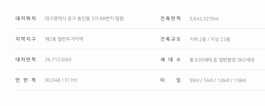 전용면적별로 59㎡ 159가구, 74㎡ 197가구, 126㎡ 가구, 138㎡ 3가구 등 362가구를 일반에 분양합니다. 이 단지는 대구지하철 1호선 칠성시장역을 걸어서 이용할 수 있고, 지하철2호선 경대병원역과 경부고속철도 동대구역과도 가깝다고 분양사는 소개했다.