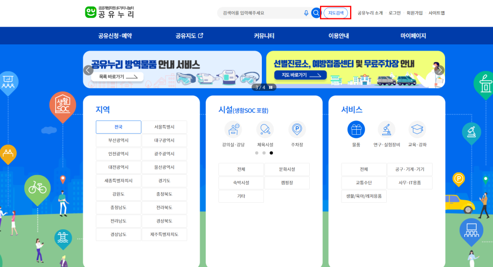 2. 검색을 원하는 지역과 시설/서비스를 선택합니다.