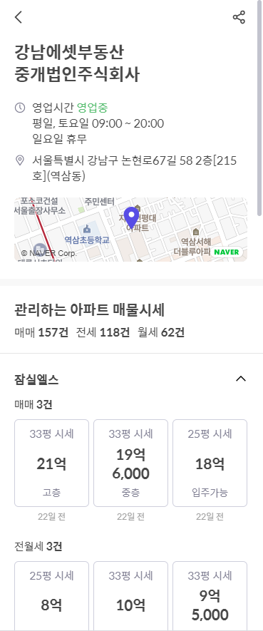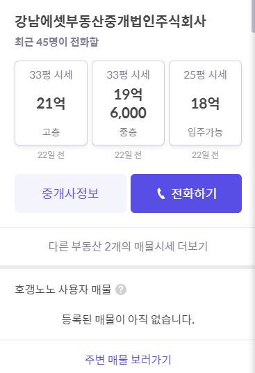 해당 아파트를 누르면 평형대별 시세(실거래가)와 준공연도·가구수·용적률뿐 아니라 주변 학군·호재·지역 주민평가까지 모든 정보를 한눈에 볼 수 있다. 해당 매물 하단 ‘공인중개사 사무소’ 정보창을 누르면 곧장 물건을 등록한 중개인과 연결된다. 누적 몇 명이 전화했는지까지 확인 가능하다. 내 손안에서 아파트의 모든 정보를 보고 공인중개사 연결까지 원스톱에 해결이 가능한 것이다.