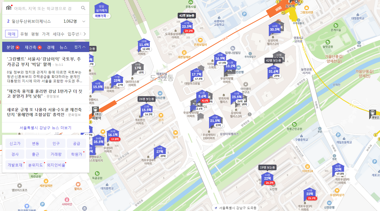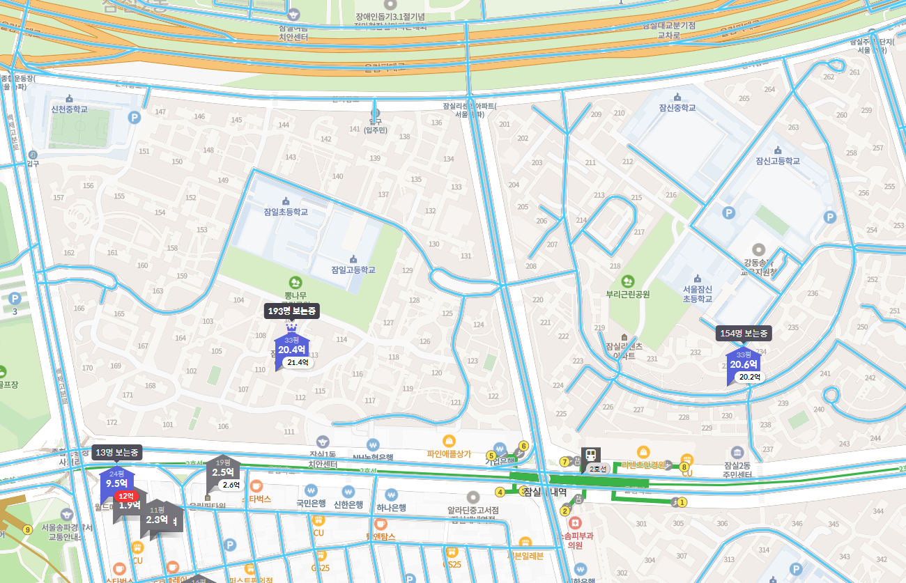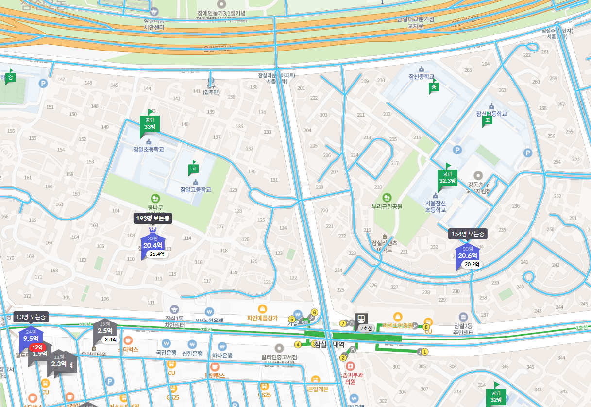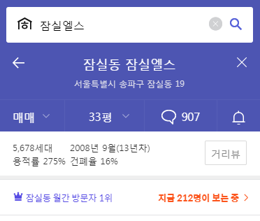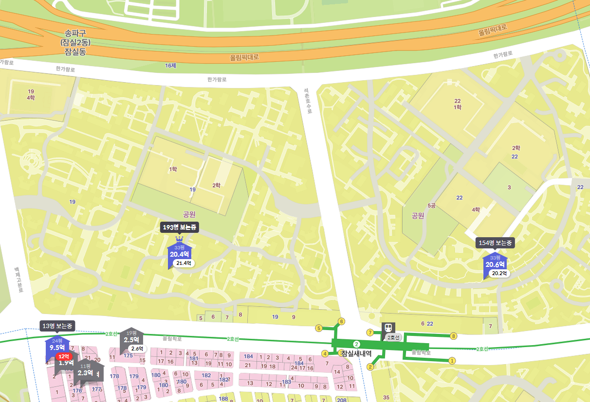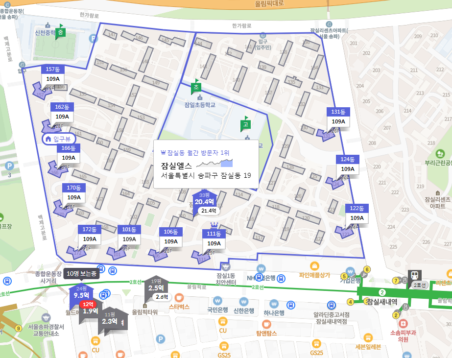 네이버부동산보다 상당히 직관적으로 잘 만들었는데요. 그냥 클릭해보고 이것저것 해보다보면 기본적인 기능은 모두 이해하고 사용할 수 있습니다. 애플의 창업자 스티브 잡스가 가장 잘 만든것은 메뉴얼없이 사용할 수 있는 디바이스, 프로그램이라고 했는데 그 말이 생각나네요. 예를들어, 잠실엘스 단지를 들어가보면서 이야기 해볼께요.
