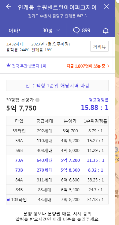 또한 분양 청약 단지에 대한 정보도 상당히 정확하고 빠르게 제공을 하고 있습니다. 개인적으로는 직방 어플과 함께 보시면 더욱 다채로운 정보와 입체적인 분석이 가능합니다. 직방의 경우 관심 분양 단지에 푸시 알람을 설정하면 분양이 시작되거나 임박하면 알람으로 알려주는 기능도 있으니 청약 분양에 관심있는 분들은 꼭 아래 참고하세요.