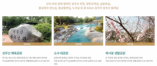 성주산 숲세권과 소새울역 역세권의 더블세권 아파트로서도 높은 평가를 받을 것으로 보인다. 전세대 조망권을 확보했을 뿐 아니라 남쪽으로는 성주산의 파노라마 뷰, 동쪽으로는 시티뷰가 시원하게 펼쳐지며 총 42km 성주산 둘레길, 성주산체육공원 등의 3만평 근린공원도 인근에 위치한다.