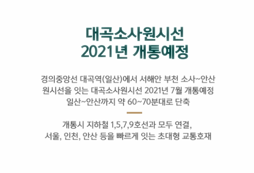 소새울역 역세권일 뿐 아니라 인근 교통호재에 대한 기대도 매우 높은 곳이다. 먼저 대곡소사원시선이 2021년 개통을 앞두고 있다. 교통호재 덕분에 큰 프리미엄이 예상되는 단지를 아래에서 확이해 보세요.