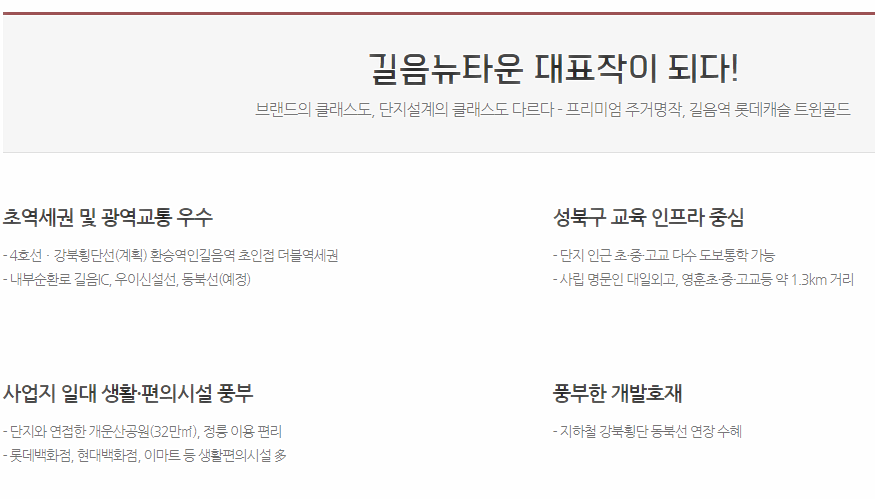 `길음역 롯데캐슬 트윈골드`는 주거복합의 명가 롯데건설이 2016년 `롯데캐슬 골든힐스`를 시작으로 2019년에 `길음 롯데캐슬 클라시아` 이후 3번째로 분양하는 주거복합단지이다.