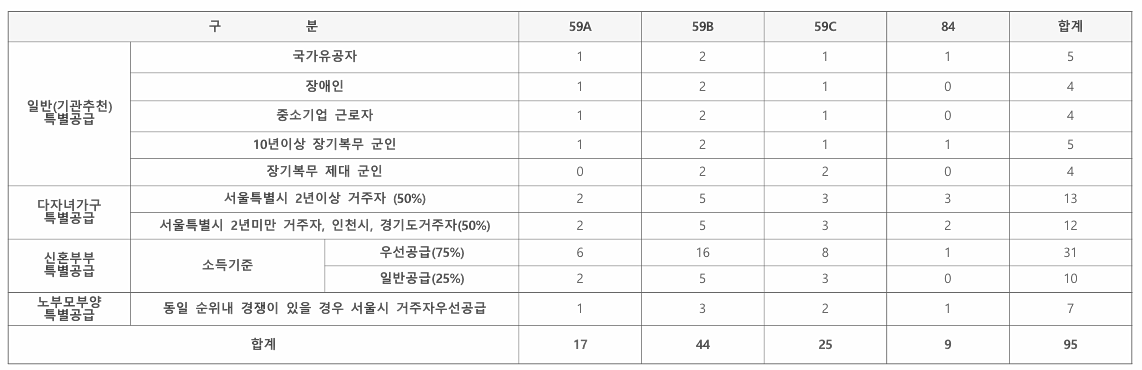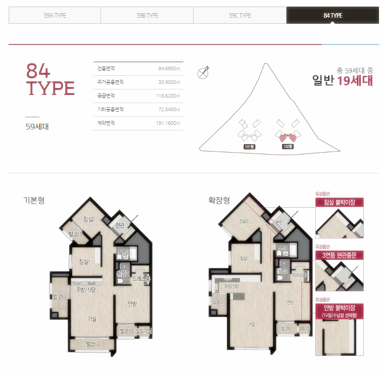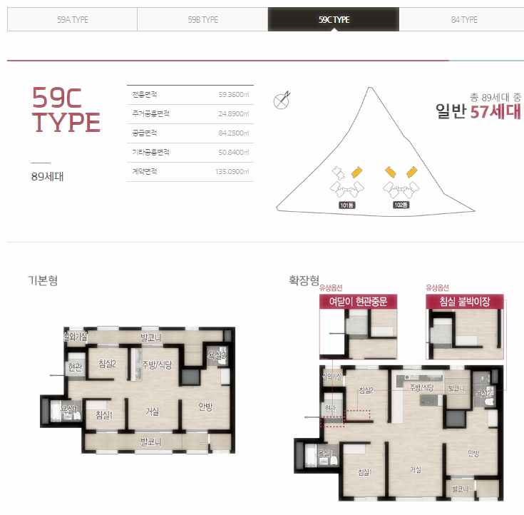 전용 면적형에 따른 일반분양 물량은 59㎡A 38가구, 59㎡B 104가구, 59㎡C 57가구, 84㎡ 19가구다.