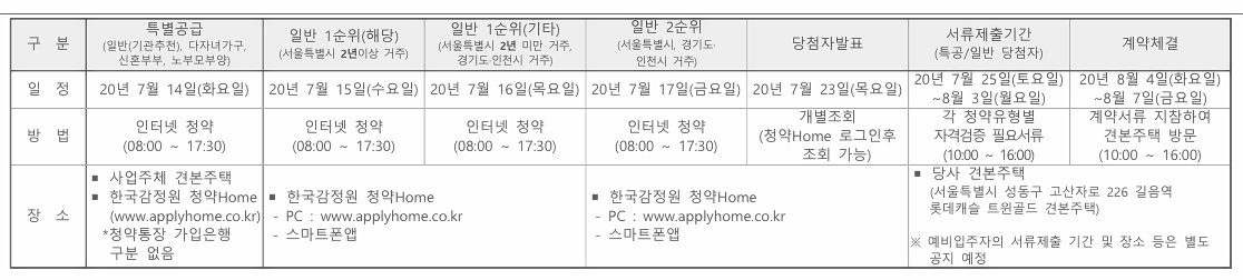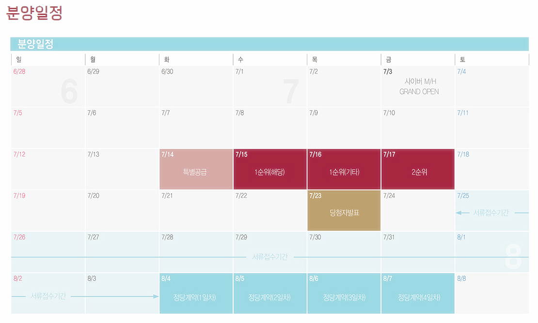청약일정은 7월 14일(화) 특별공급을 시작으로 15일(수) 1순위 청약을 진행하며, 23일(목) 당첨자 발표가 이루어진다. 정당계약은 8월 4일(화)~7일(금)까지 4일간 진행한다.
