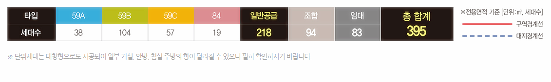 면적형에 따른 일반분양 물량은 ▲전용면적 59㎡A 38세대 ▲전용면적 59㎡B 104세대 ▲전용면적 59㎡C 57세대 ▲전용면적 84㎡ 19세대