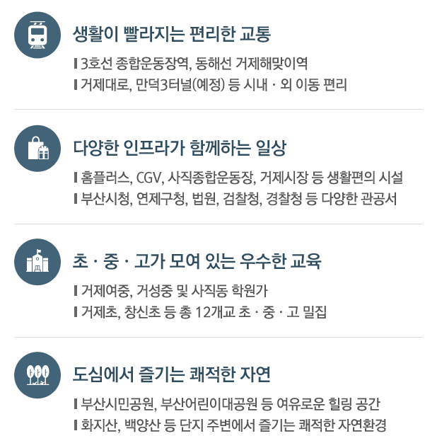 종합운동장역에서 1·3호선 환승역인 연산역과 2·3호선 환승역인 수영역까지 편리하게 이동할 수 있다. 또 거제초, 창신초, 거제여중, 거성중이 인접해 있고, 사직동 학원가도 가까이 위치해 있다.