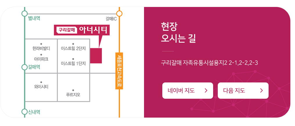 한편, 구리갈매 아너시티의 모델하우스는 경기도 구리시 동구릉로에 자리하고 있다.