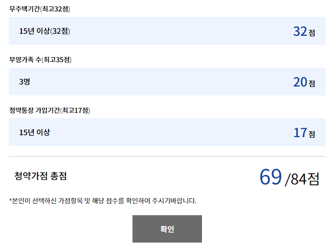 청약점수 계산기로 알아본 가점 총점은 84점 만점에 69점이 나왔습니다. (예시)