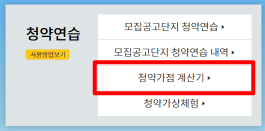 첫 화면의 하단을 보시면 위와같이 청약연습 메뉴가 보이고 청약연습 청약가점 계산기 코너를 이용할 수 있습니다.